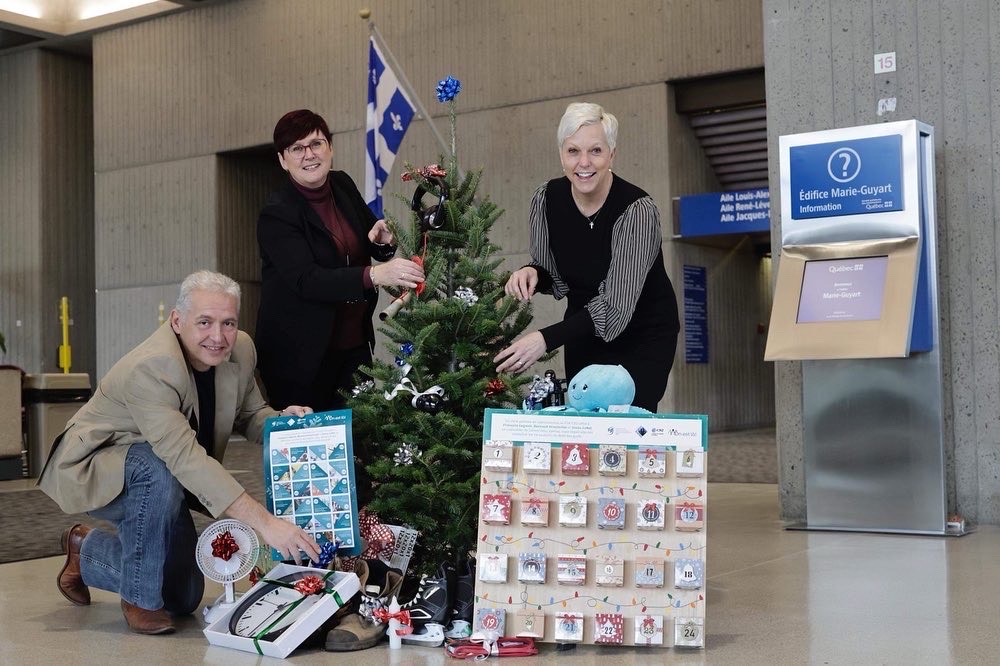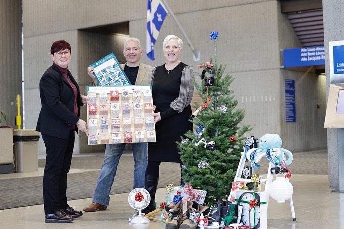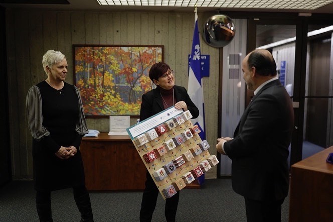 Aujourd’hui la présidente de l’APEQ, Heidi Yetman et la présidente de la FSE, Josée Scalabrini ont livré un calendrier de l’avent au bureau du ministère de l’Éducation.